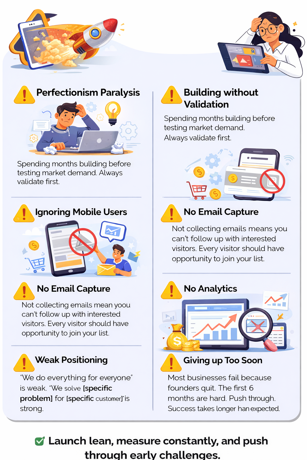 Perfectionism paralysis: Your version 1.0 will never be perfect. Launch, gather feedback, improve. Delaying for perfection means zero customers giving you money to improve.