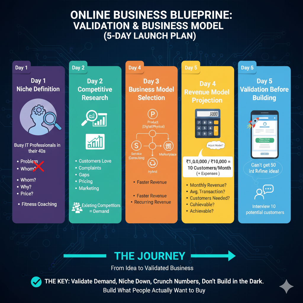 This blueprint walks you through everything you need to launch a professional online business in 30 days—from idea validation to your first customer. No fluff, no theory, just the exact steps that separate successful online businesses from the 90% that fail.