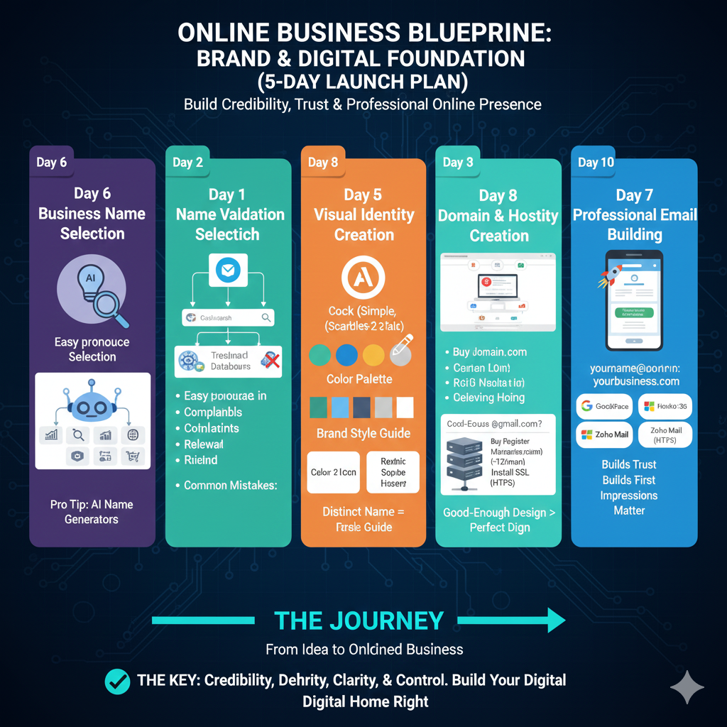 Brand (Days 6-10) □ Select and validate business name □ Create visual identity □ Register domain and hosting □ Set up professional email □ Document brand guidelines