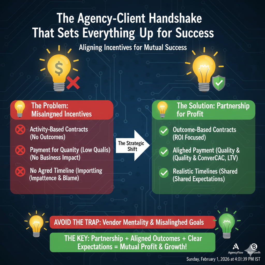 The final foundation piece is the relationship structure between business and agency. Most agency-client relationships are set up to optimize for the wrong outcomes, creating misaligned incentives that guarantee mediocre results.